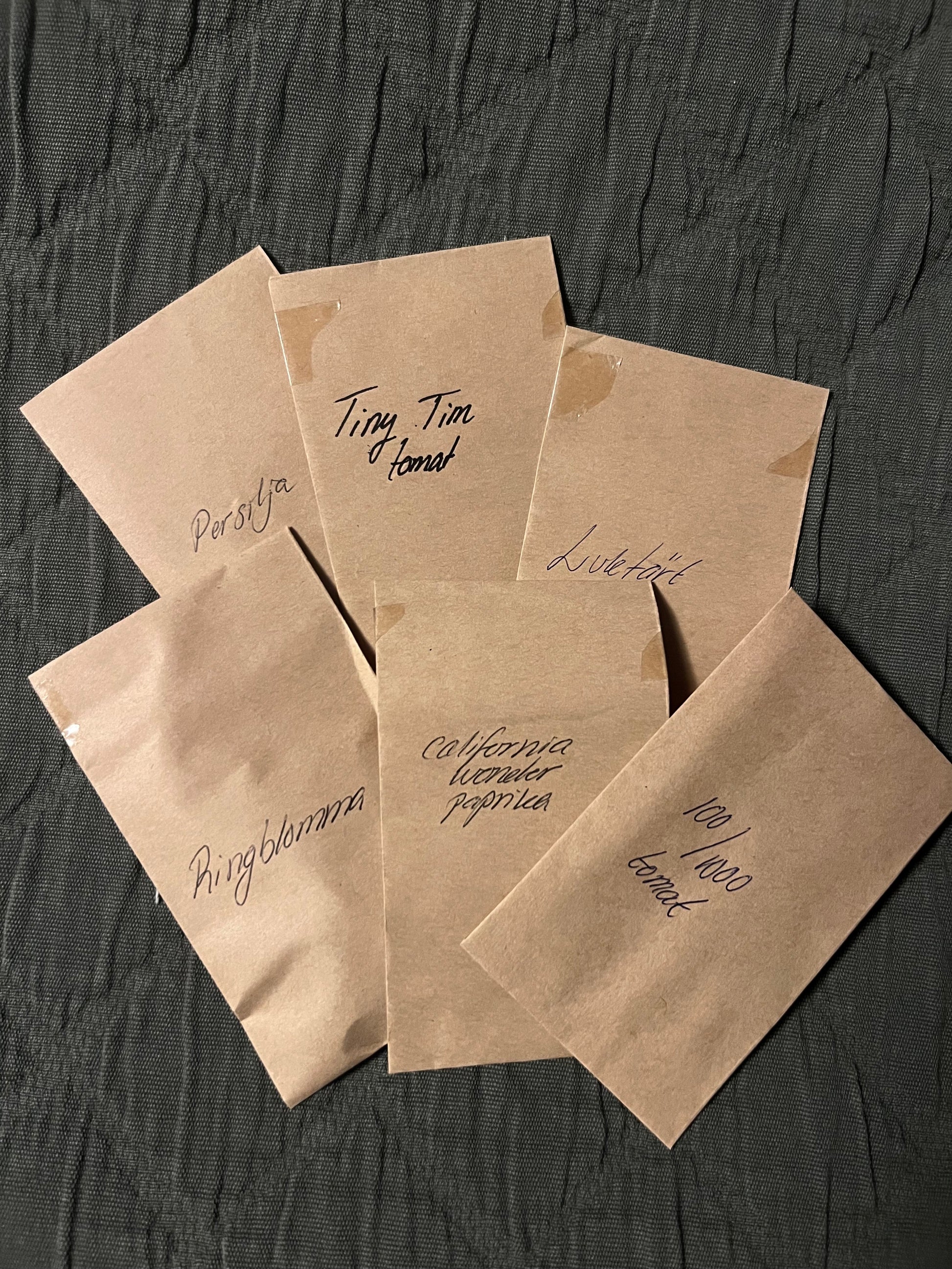 En gåva som räcker långt in på nästa säsong! Alla fröer kommer från mina egna plantor och är varsamt insamlade. Paketet innehåller:
